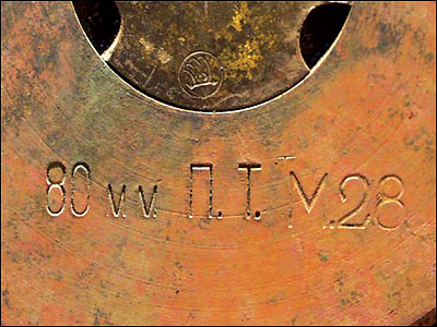 Маркировка гильзы снаряда: 83 мм – калибр, ПТ – противоаэропланный топ (противоаэропланное орудие), М28 – модель 28